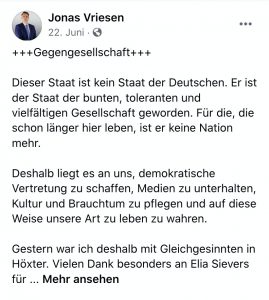 Die offene Kooperation mit der Thule-Seminar-Führungsfigur Weecke belegt die völkisch-nationalistische Ausrichtung der AfD Höxter und der anderen Kreisverbände in OWL. Überdies bricht das rassistische Propaganda-Video von MdL Roger Beckamp mit den Bemühungen der AfD NRW, als Landesverband gemäßigt aufzutreten und so der Überwachung durch den Verfassungsschutz zu entgehen. Weecke wähnt sich dem Mars Ultor 2016 zufolge „im dritten Weltkrieg“ und sieht das „deutsche Volk von der Ausrottung bedroht“ – das ist selbst für die rassistische und neofaschistische AfD ungewohnt deutlich formuliert! In aller Regel werden von Vertreter*innen der AfD kulturell-rassistische Ideologeme bemüht – mit Weecke wird die Grenze zum klar biologischen Rassismus überschritten! Wenn Jonas Vriesen auf facebook von einer „Gegengesellschaft“ schwadroniert, dann wird hier auf eine biologistisch-rassistischen „Staat der Deutschen“ rekurriert!