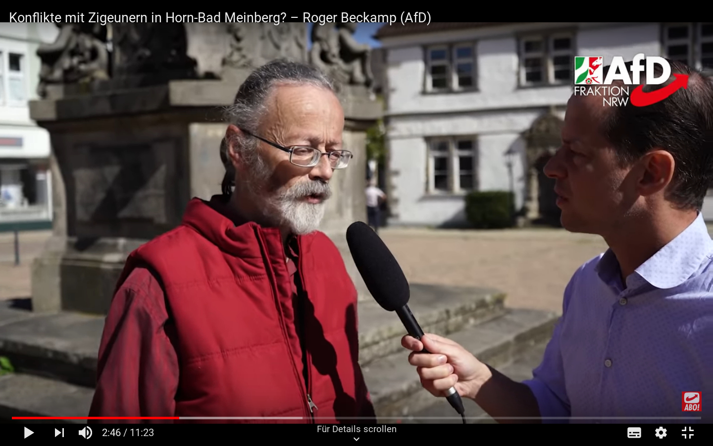Jonas Vriesen frohlockt nach dem Treffen mit dem stellvertretenden Thule-Seminar-Leiters Weecke von einer „Gegengesellschaft“ (siehe Screenshot vom 22.06.2020). Sechs Tage später tritt Weecke dann in einem rassistischen Propaganda-Video für den AfD Landtagsabgeordneten Roger Beckamp auf,gedreht in Horn-Bad Meinberg. In einem über fünf Minuten langen Interview darf der wegen Volksverhetzung angeklagte Weecke rassistisch gegen dort lebende Sinti und Roma agitieren, reproduziert antiziganistische Stereotype und spricht von „Ghettobildung“5. Weecke wird in dem Video nicht mit Namen vorgestellt, sondern als besorgter, betroffener Bürger stilisiert.