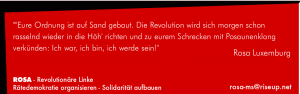 Wir sehen es als Aufgabe der radikalen Linken an, solidarische Strukturen zu schaffen, um sich gegen diese zerstörerischen Verhältnisse und für eine andere Gesellschaft zu organisieren. Lasst uns mit allen, die von diesen Verhältnissen unterdrückt werden, Widerstand gegen das kapitalistische und patriarchale System aufbauen und Alternativen dazu schaffen – sei es im Stadtviertel, auf der Arbeit, beim Jobcenter, in der Uni, in der Schule oder zuhause. Lasst uns den Traum einer anderen Gesellschaft in unserem Alltag und dem unserer Mitmenschen spürbar machen. Lasst uns Kämpfe zusammenführen und zuspitzen anstatt sie kleinzuhalten – wenn wir uns zusammenschließen, werden wir gewinnen!