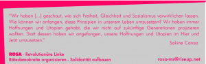 Wir von ROSA stellen uns eine solche Gesellschaft in Form einer Rätedemokratie vor, deren Herzstück die gemeinsame Organisierung mit den Menschen in unserer Straße und unserem Viertel ist. Stadtteil-Räte sollen der Ort sein, an dem die Bewohner*innen zusammenkommen um über die sie betreffenden Dinge selbst zu entscheiden und diese dann auch umzusetzen. Nur Entscheidungen, die Auswirkungen auf andere Stadtteile oder Regionen haben, müssen dann auf einer höheren Ebene getroffen werden. Dieses System baut sich somit von unten nach oben auf. Entscheidungsträger der höheren Ebenen können jedoch auch nur im Sinne der Basis in den Stadtteilen entscheiden und jederzeit zurückgerufen werden.