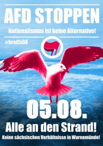 Am Sonntag den 05.08. will die AfD erneut in Rostock aufmarschieren. Diesmal haben sie sich das touristische Warnemünde ausgesucht um ihre faschistische Propaganda zu verbreiten. Ihre Kundgebung ist ab 16 Uhr am Leuchtturm Warnemünde angemeldet- direkt neben dem Strand. Es wird breiten antifaschistischen Protest geben! Beteil