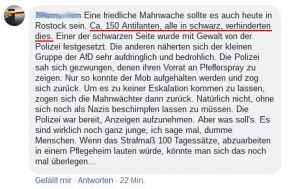 Der tödliche Messerangriff auf einen Menschen in Chemnitz, den Rassist_innen in der sächsischen Stadt instrumentalisieren und seit Tagen für Gewalt gegen nicht-weiße und linke Menschen missbrauchen, wollte auch die AfD in Mecklenburg-Vorpommern für sich nutzen. Der AfD-Landtagsabgeordnete Weber rief gestern in einem Facebookpost zu „Mahnwachen“ in mehreren Städten des Landes auf. Auch in Rostock sollte eine derartige Veranstaltung abgehalten werden. Rund 300 Antifaschist_innen durchkreuzten diesen Plan allerdings. Sie besetzten kurzer Hand den Marktplatz, auf dem sich die Rechten versammeln wollten. Einige Neonazis, die um den Kundgebungsort herumlungerten, mussten stiften gehen oder sammelten unangenehme Eindrücke. Nachdem sie die Rassist_innen von der Undurchführbarkeit ihrer Pläne ausreichend überzeugt hatten, zogen die Antifaschist_innen mit einer Demonstration vom Markt ab. Der Schlag scheint gesessen zu haben, online wird kräftig rumgeheult über die verhinderte Propagandaveranstaltung.