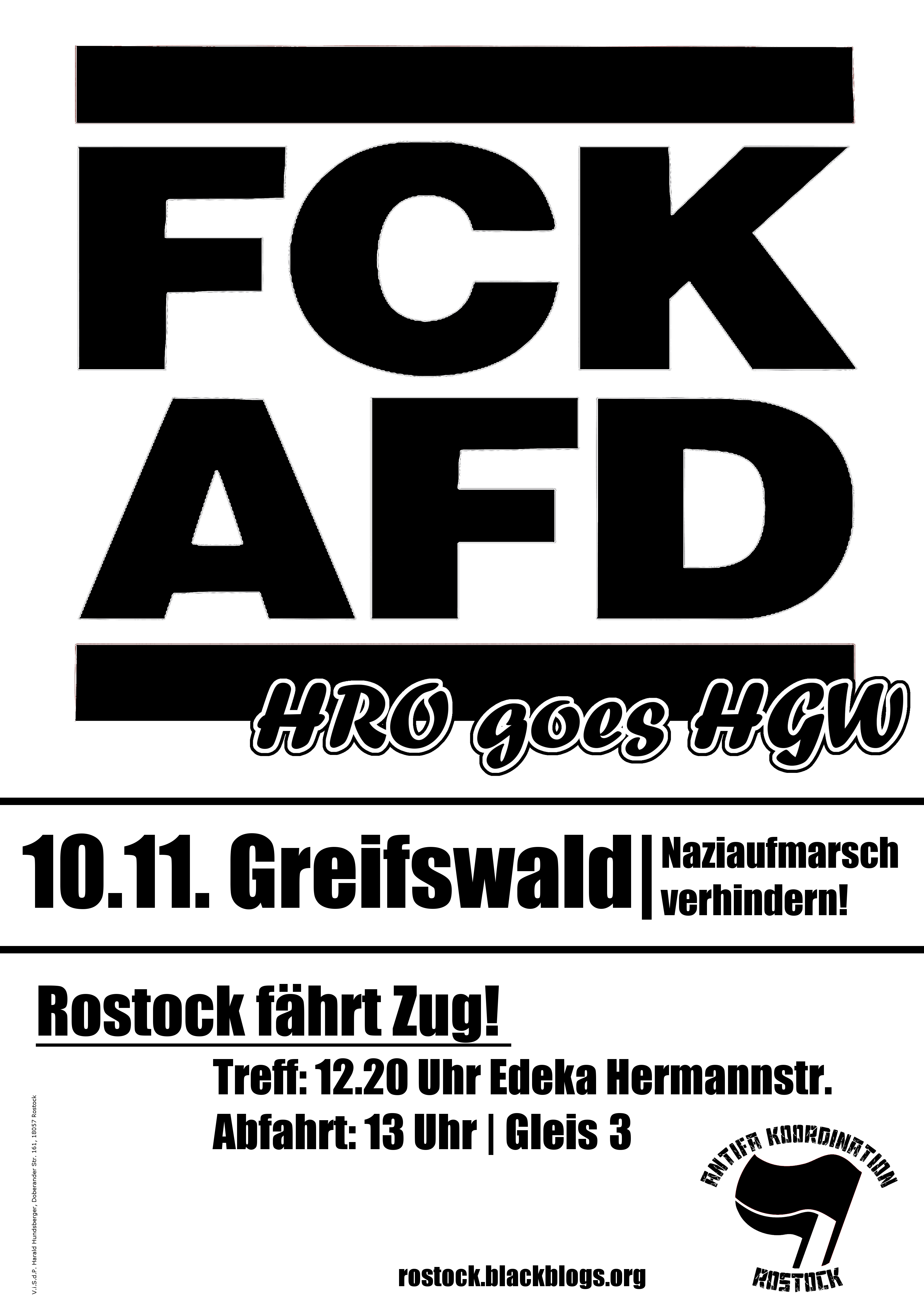 Am 10. November wollen die Rassist*innen von AfD und Co. in Greifswald aufmarschieren. Das kennen wir in Rostock mittlerweile zu genüge. Die Genoss*innen aus Greifswald sind uns dabei oft zu Hilfe gekommen und haben uns in unseren Aktionen gegen die AfD unterstützt. Nun ist es Zeit den Spieß umzudrehen und praktische Solidarität mit den Antifas in Greifswald zu üben. Darum fahrt mit uns gemeinsam in die Stadt am Ryck.