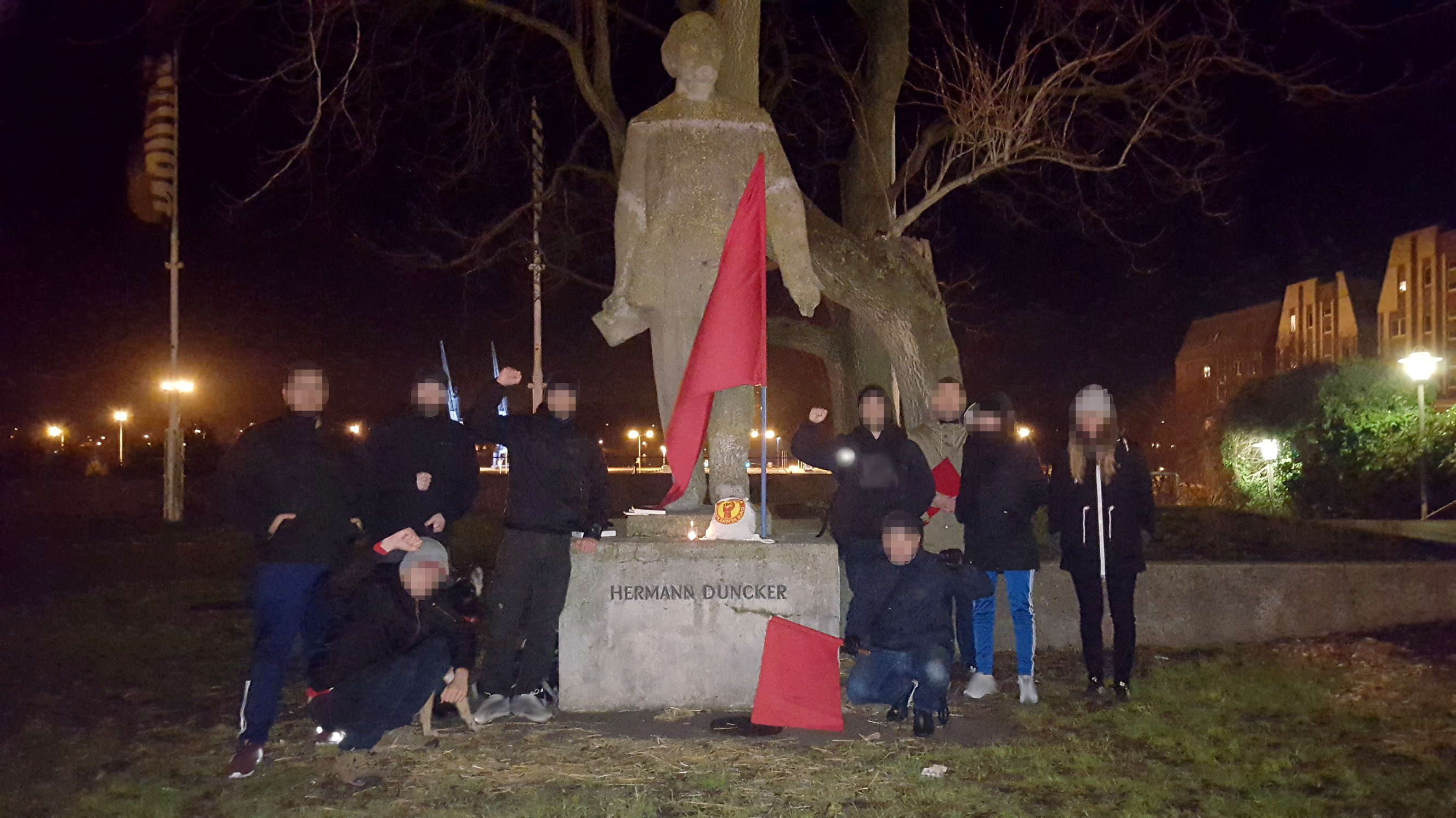 Am Abend des 30. Dezember fanden wir uns spontan aus verschiedenen Gruppen und als Einzelpersonen zusammen, um dem 100. Jahrestag der Gründung der Kommunistischen Partei Deutschlands (KPD) zu Gedenken. Bei der Statue des Kommunisten Hermann Duncker, unweit des Rostocker Hafens standen wir in Solidarität zusammen, um dem Geschehenen Tribut zu zollen. Auch wenn unser Zusammentreffen kurzfristig organisiert wurde, konnten wir einige Worte zur geschichtlichen Einordnung erbringen sowie ein kämpferisches Grußwort hören. Auch wurden einige Worte zu der Revolution von 1918/1919 verloren. Vorbeiziehende Passanten bedachten uns mit wohlwollenden Ineresse, während wir unter roter Fahne unsere Gedanken und Zukunftsaussichten teilten. Im Folgenden ist das Grußwort der Gruppe »Rostock Hart Backbord« protokolliert: