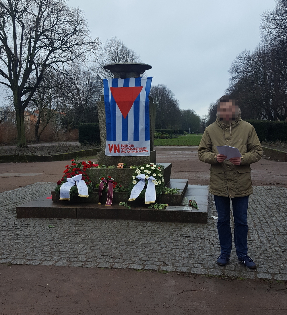 Anlässlich des Gedenktages für die Opfer des Nationalsozialismus trafen sich am Sonntag, den 27.1.2019, in Rostock zahlreiche Antifaschist*innen zum antifaschistischen Gedenkspaziergang. Gemeinsam wurde vom Doberaner Platz zum Denkmal „Für die Opfer des Faschismus“ im Rosengarten spaziert. Unterwegs wurden an mehreren Stolpersteinen Blumen niedergelegt. Im Rosengarten fand im Anschluss die Gedenkveranstaltung des VVN-BdA statt. Nach dem Niederlegen von Blumen und Gebinden beendete ein Genosse unserer Struktur das Gedenken mit einer emotionalen und kämpferischen Rede vor rund 80 Menschen.