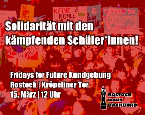 Die Lebensbedingungen auf diesem Planeten gehen uns alle etwas an, schließlich müssen wir ihn uns teilen. Kommt deshalb alle am 15. März um 12 Uhr zum Kröpeliner Tor und zeigt euch solidarisch mit dem Kampf um die Zukunft der Jugend, auch wenn ihr selber schon älter seid.