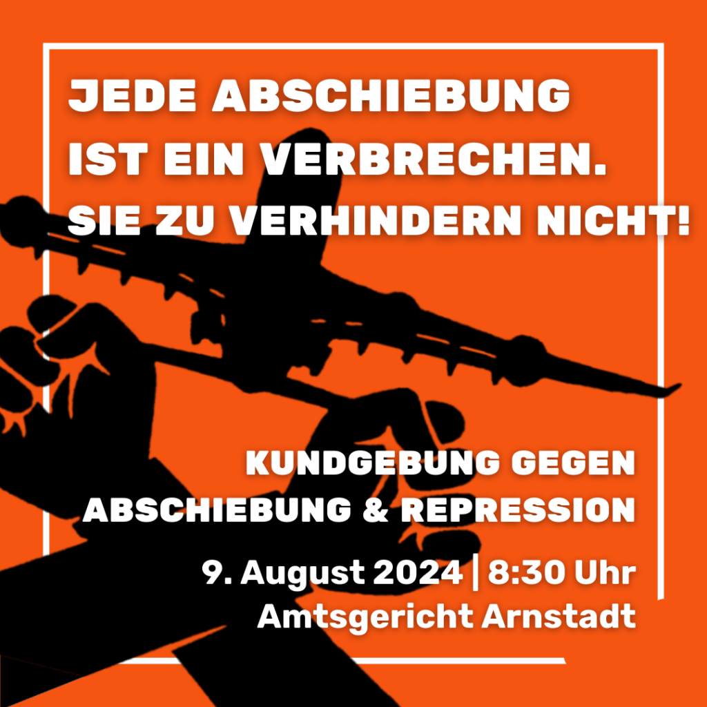 Letzte Woche wehrte sich ein:e Aktivistin am Amtsgericht Arnstadt ein gegen ein Bußgeld. Vorwurf und Anlass für die Geldforderung war eine Blockadeaktion gegen eine Abschiebung im vergangenen Jahr. Der Prozess wurde offensiv und politisch geführt und draußen vor dem Gericht von einer solidarischen Kundgebung gegen Abschiebung und Repression begleitet. Das Gerichtsverfahren endete in diesem Fall erfolgreich mit einem Freispruch. Prozesse gegen viele weitere Aktivist:innen stehen noch an.