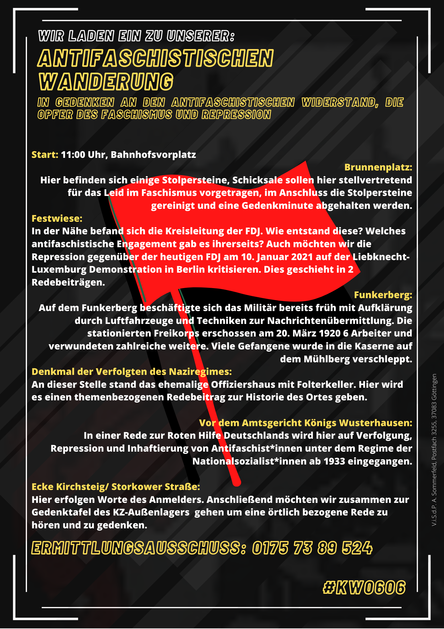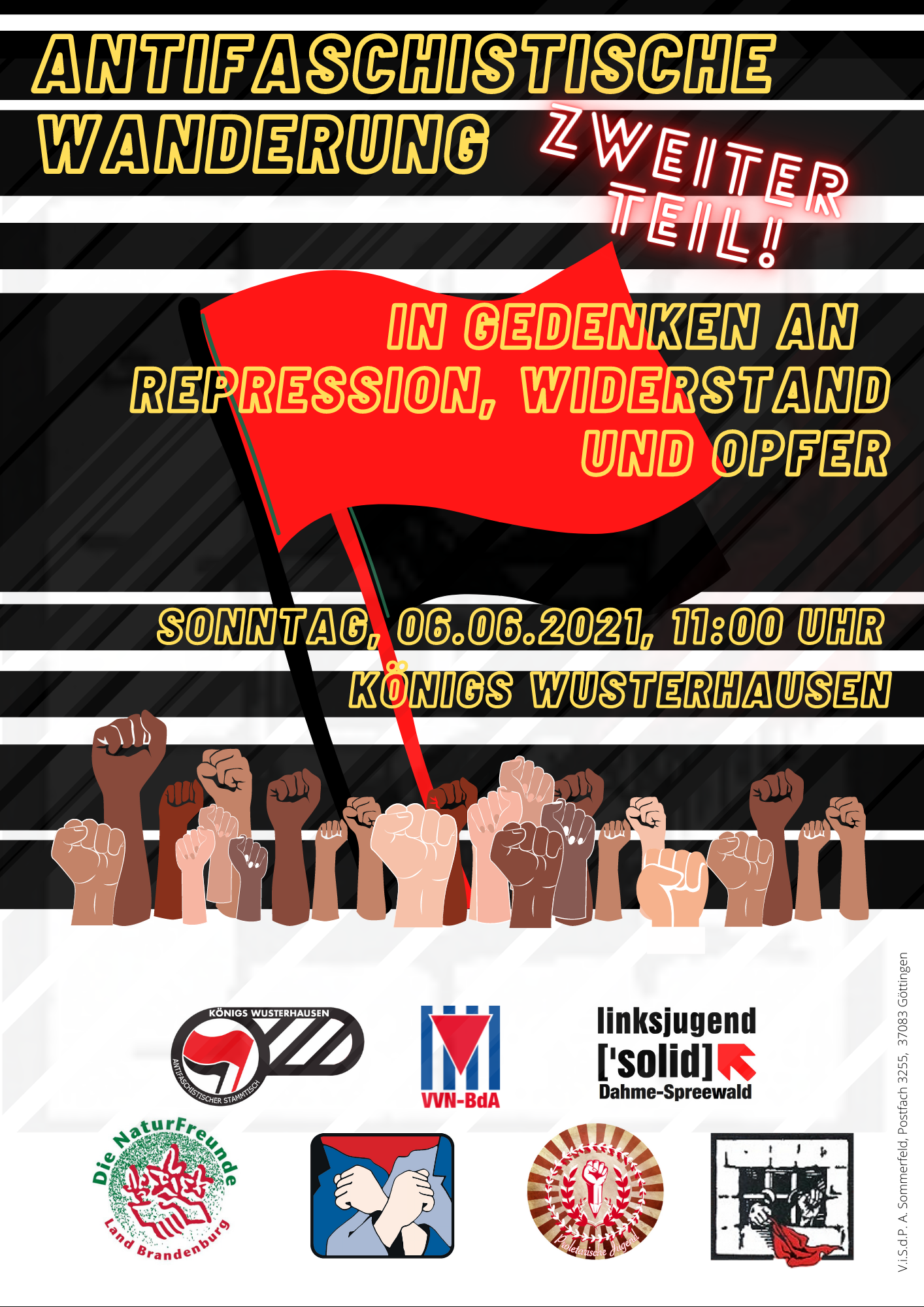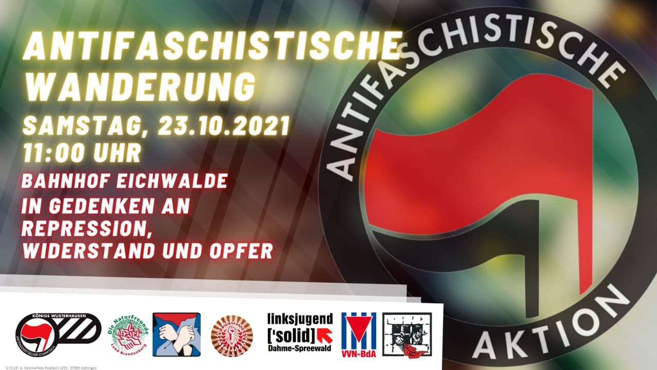 In Gedenken an den antifaschistischen Widerstand, die Opfer des Faschismus und Repression findet am 06.06.2021 eine Wanderung durch Königs-Wusterhausen statt.