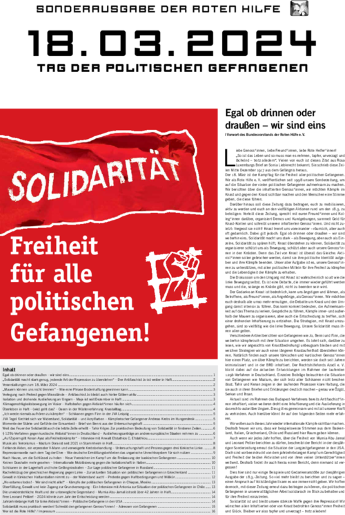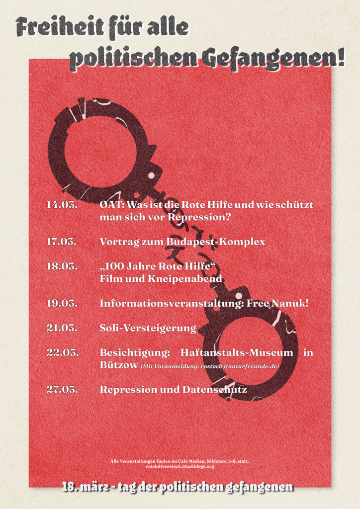 Der 18. März steht für den internationalen Kampftag für die Freilassung aller politischen Gefangenen. Als politische Gefangene werden jene Menschen eingestuft, die nicht nur wegen im jeweiligen Staat verbotener politischer Aktivitäten oder Meinungsdelikten festgehalten werden, sondern alle, bei denen die politische Einstellung oder Aktivitäten maßgeblichen Einfluss auf die Strafzumessung hatten.