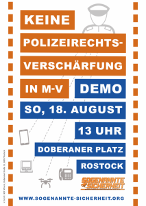 Es geht weiter! Am Sonntag vor der ExpertInnenanhörung im Landtag, am 18.08., wollen wir in Rostock gegen das neue SOG demonstrieren.