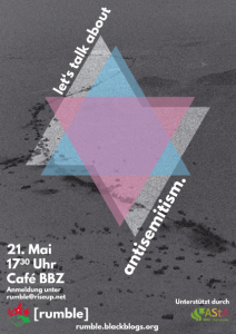 »Vor Antisemitismus ist man nur noch auf dem Mond sicher«, meinte die Philosophin Hannah Arendt im Jahr 1945. Seit den Gräueltaten der Nazis und ihrer Verbündeter sind über 60 Jahre vergangen und doch ist Antisemitismus in Deutschland weiterhin präsent. Dabei haben sich vielschichtige Erscheinungsformen des Antisemitismus im Laufe der Geschichte vermischt und Vorurteile und Ressentiments, die bis heute präsent sind, hervorgebracht. Die Naturfreunde Eberswalde und [rumble] laden zu einem dreistündigen Workshop ein, bei dem die Erscheinungsformen erläutert und Licht ins Dunkel der Begriffsverwirrungen gebracht werden. Schwerpunkte liegen auf den Kontinuitäten und Diskontinuitäten antisemitischer Stereotype sowie der aktuellen Betrachtung von Antisemitismus in Form von Kritik am Staat Israel. Der Wokshop wird vom Apabiz (https://www.apabiz.de/) durchgeführt. Da die Teilnahme beschränkt ist, meldet euch vorher an unter: rumble[at]riseup.net