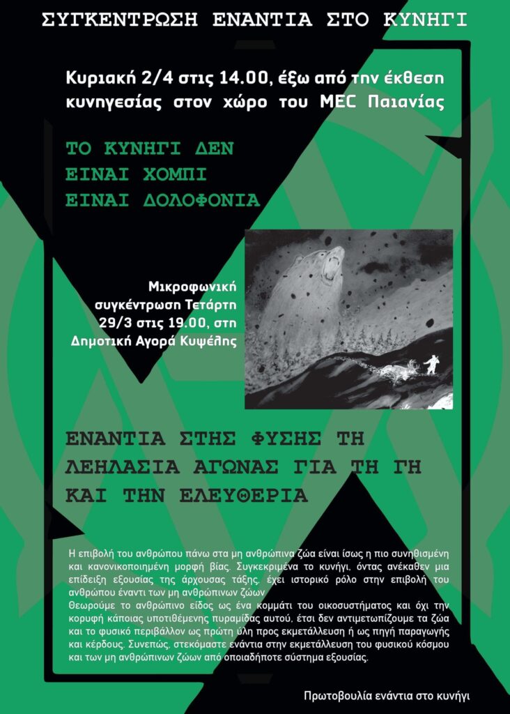 Ας γίνουμε πραγματική απειλή, εμπόδιο στα σχέδιά τους. Καλούμε σε κουβέντα με σκοπό να συνδιαμορφώσουμε τις δράσεις μας ενάντια στο κυνήγι και τους υποστηρικτές του.