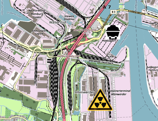 Bei Hamburg-Waltershof treffen die Bahnlinien auf denen die UF6 Transporte aus Waltershof in die Urananreicherung und die Kohletransporte vom Hansaport in die Kohlekraftwerke geschickt werden zusammen.