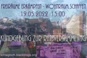 Zu der Kundgebung am 19.5. auf dem Rathausplatz zur Ratsversammlung erschienen trotz schlechter Uhrzeit für eine große Mobilisierung 70 Unterstützer*innen, zudem beteiligen sich die Meierei, TKKG, das Bündnis für bezahlbaren Wohnraum, die Linke und die Partei mit Redebeiträgen. Mit einer kleinen Inzienierung spielten wir das Theater nach, welches wir die letzten Monate, mit unserer Forderung auf das MFG 5 Gelände zu ziehen, mit den politischen Entscheidungsträger*innen der Stadt hatten.