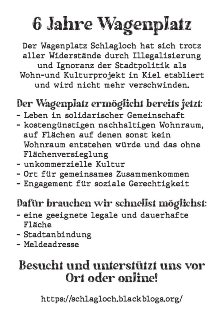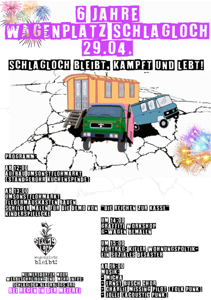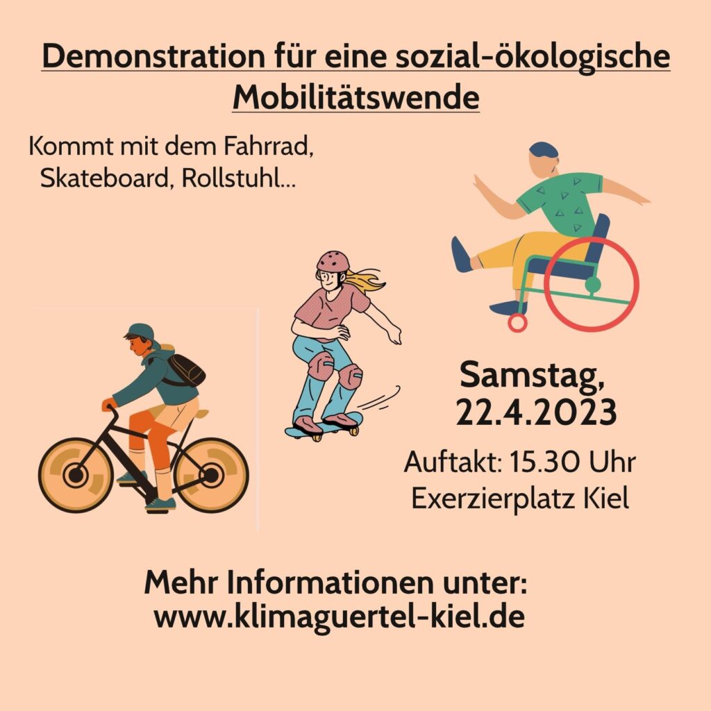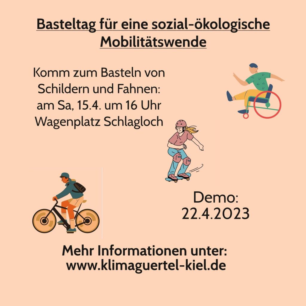 Am 22.4.geht es für das Schlagloch zusammen mit vielen anderen Kieler Gruppen, im Zuge der bundesweiten Aktionstage zur Mobilitätswende, auf die Straße. Seid gern dabei und kommt auch zum anschließenden gemeinsamen Ausklang auf dem Wagenplatz vorbei! Wir freuen uns auf euch!