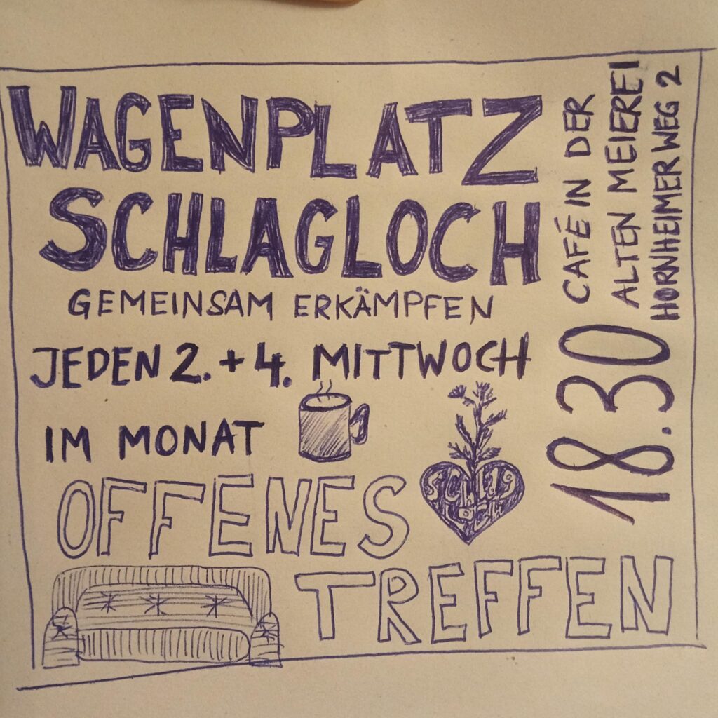 Wir laden alle interessierten Menschen ein mitzumachen. Auch Menschen die hier nicht wohnen, können hier kreativ werden, den Platz nutzen und mit uns gemeinsam für einen dauerhaften Wagenplatz Schlagloch und eine Stadtentwicklung von unten streiten !