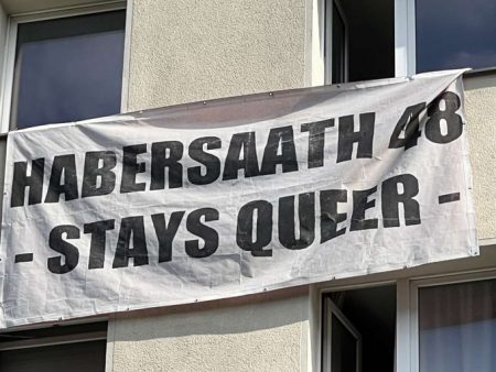 Rund 80 Personen – nicht FLINTA*-only – kamen am 13.07.2022 zur Kundgebung vor die Habersaathstraße 48, die vom dortigen selbstorganisierten FLINTA*s & Queer Safe Space (@schneckengang: https://twitter.com/SchneckeMitte) initiiert wurde, um für den Erhalt selbstverwalteter Schutzräume und gegen Abriss und Spekulation zu protestieren.