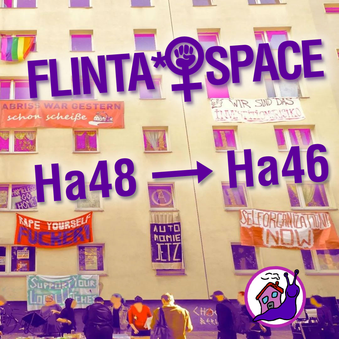 Neue Bewohner:innen und der FLINTA* Safe Space haben nun – am 26.11.2022 –verkündet, dass die Habersaathstraße 46 ganz konkret in die Selbstverwaltung überführt wurde und der Safe Space der FLINTA* von der Ha48 in die Ha46 umgezogen sein soll: „Es ist soweit! Zum internationalen Tag zur Beseitigung der Gewalt gegen FLINTA* wurde die Ha46 (Habersaathstraße 46) in die Selbstverwaltung überführt.“ https://schneckenblog.blackblogs.org/2022/11/flinta-safe-space-goes-ha46…“>https://schneckenblog.blackblogs.org/2022/11/flinta-safe-space-goes-ha46…