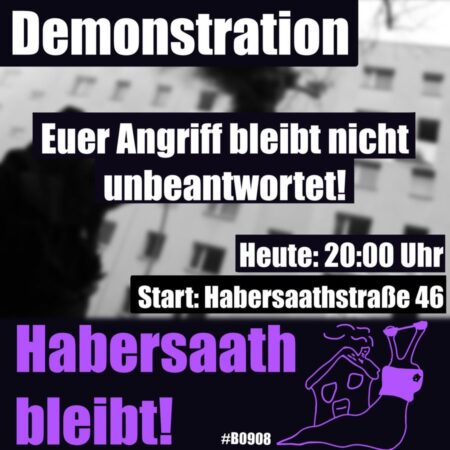 Für 20:00 wurde am selben Tag spontan von solidarischen Menschen zu einer Demo aufgerufen unter dem Motto „Euer Angriff bleibt nicht unbeantwortet – Habersaath bleibt (Link: Indymedia)“.