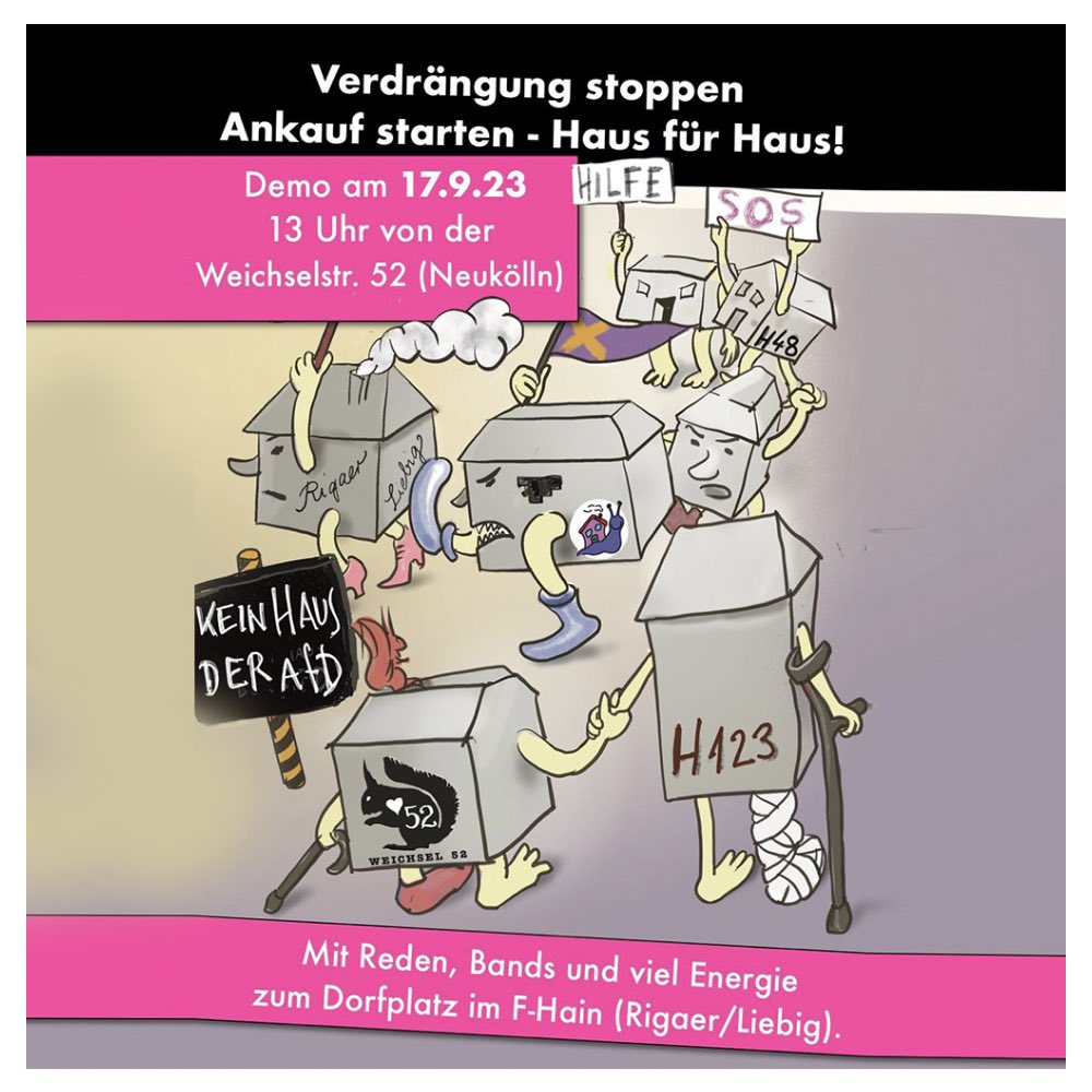 Schon ein paar Tage vor der Demo gab es positive Neuigkeiten: Die Gemeinschaft der Weichsel 52 hatte Erfolg: Der Senat macht vom Vorkaufsrecht Gebrauch. Wir gratulieren euch herzlichst, dass euer gestecktes Ziel erreicht worden ist.