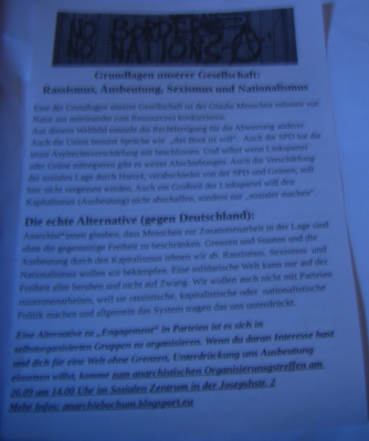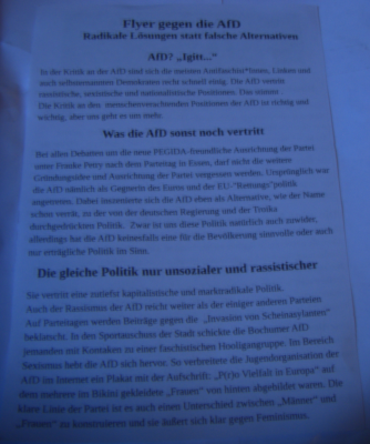 Wir selber haben Flyer verteilt, die sich in radikaler Weise mit der AfD und auch dem Rassismus und Klassismus der anderen Parteien auseinandersetzten. Hier deren Text: