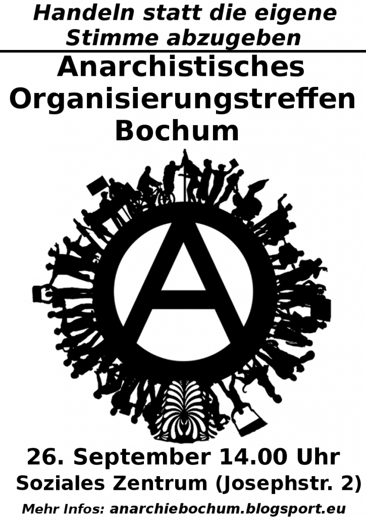 Wir wollten nochmal alle Menschen an das anarchistische Organisierungstreffen am 26.09 erinnern (Unseren Aufruf finde Ihr hier). Das Treffen findet im Sozialen Zentrum in der Josephstr. 2 statt und beginnt um 14,00 Uhr.