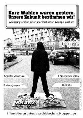 Um eine gemeinsame Struktur für anarchistische Kämpfe zu bieten, wollen wir in Bochum eine anarchistischen Stadtgruppe gründen. Von dieser Gruppe ausgehend wollen wir ein breites Netzwerk aufbauen. Denn auf dem anarchistischen Organisierungstreffen haben wir nicht nur festgestellt, dass es viele motivierte Menschen gibt, die an verschiedenen Themen arbeiten wollen. Es gibt auch bereits Gruppen und Projekte, die selbstorganisiert an einer anderen Welt arbeiten.