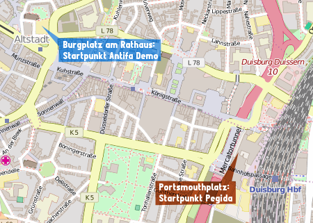 Da die Polizei auch unsere Demo leider nicht schikanefrei durchgehen lässt, müssen wir unsere Route ändern. Neuer Auftaktort ist deshalb der Burgplatz am Duisburger Rathaus (901-Haltestelle „Rathaus“). Von hier aus laufen wir wie geplant um 18 Uhr durch die Innenstadt zum Hbf, dem Ort des Pegida-Aufmarschs.