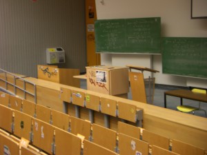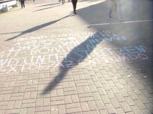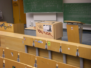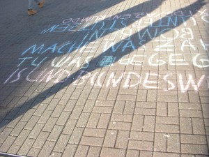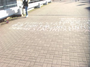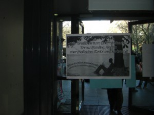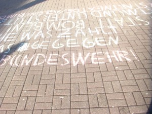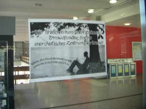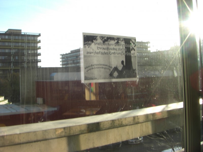 Dienstag und Donnerstag wurde an der Ruhr-Universität die Crowdfunding-Kampagne für ein anarchistisches Zentrum in Dortmund beworben. In Hörsaalen, Cafeten und an Türen wurden Plakate aufgehängt. Außerdem wurden Flyer verteilt. Auf der Unibrücke wurde, angesichts der zunehmenden Militarisierung und dem bevorstehenden Einsatz der Bundeswehr in Syrien, folgendes gekreidet: