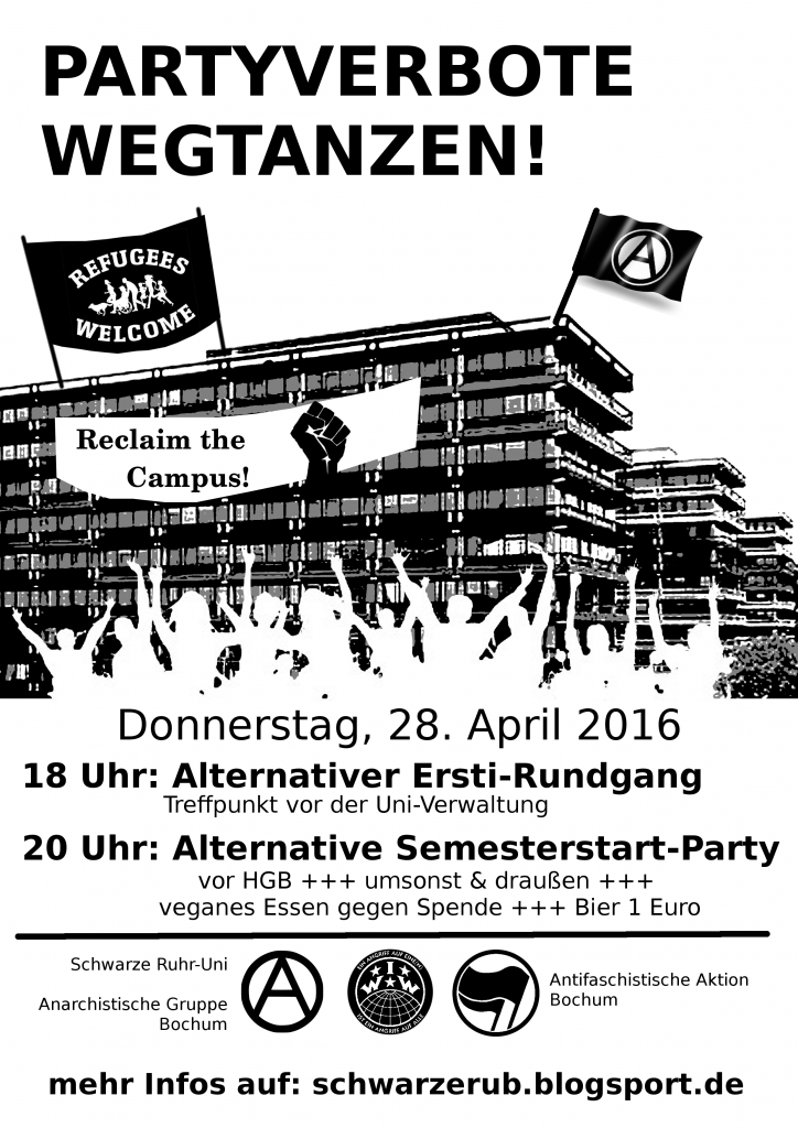 Unkommerzielle Partys sind auf dem Campus de facto verboten. Das finden wir uncool und nehmen uns deshalb einfach unangemeldet den Raum! Ab 20 Uhr wird vor dem Gebäude HGB gefeiert. Es gibt veganes Essen gegen Spende, Bier für einen Euro und gute Musik. Die Party ist außerdem eine gute Möglichkeit, um anarchistische und linke Gruppen und Initiativen der RUB und in Bochum kennenzulernen. Die Party wird organisiert von der schwarzen Ruhr-Uni, der anarchistischen Gruppe Bochum, der antifaschistischen Aktion Bochum und den Industrial Workers of the World Bochum. Alle Einnahmen gehen in anarchistische und linke Projekte.