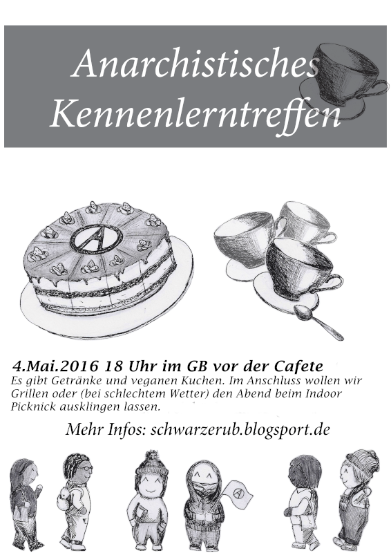 Ihr habt Lust andere freiheitlich gesinnte Menschen an der Ruhr-Uni und in Bochum kennenzulernen? In unserer Gesellschaft sind wir mit unseren freiheitlichen Einstellungen oft vereinzelt. Dabei ist gerade der Austausch mit anderen Menschen und die gegenseitige Solidarität wichtig, um den Verhältnissen etwas entgegenzusetzen. Ihr wollt nicht mehr allein mit euren Vorstellungen von einem freien Leben und euren Kämpfen sein? Dann kommt zum anarchistischen Kennlerntreffen an der Ruhr-Uni am 04.05 um 18.00 Uhr vor der Cafeteria von GB.