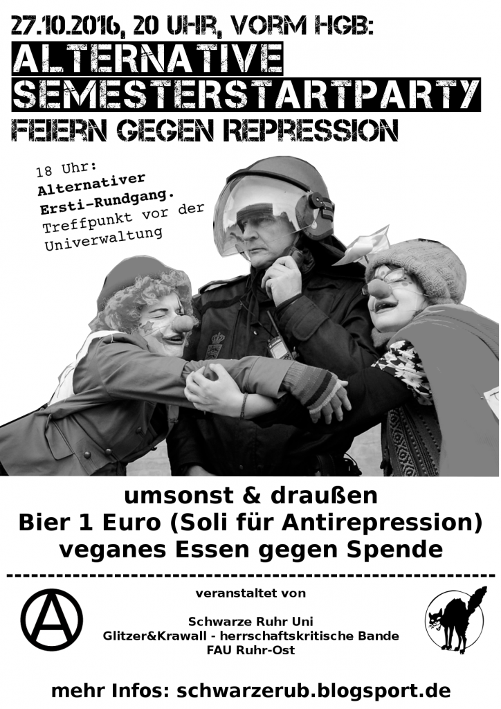 Wie jedes Semester veranstaltet die schwarze Ruhr-Uni, diesmal zusammen mit den Gruppen Glitzer&Krawall, dem anarchistischen Buch- und Kulturzentrum Black Pigeon und der FAU-Ruhr-Ost, am Donnerstag den 27.10. einen Ersti-Rundgang und eine Semesterstartparty.