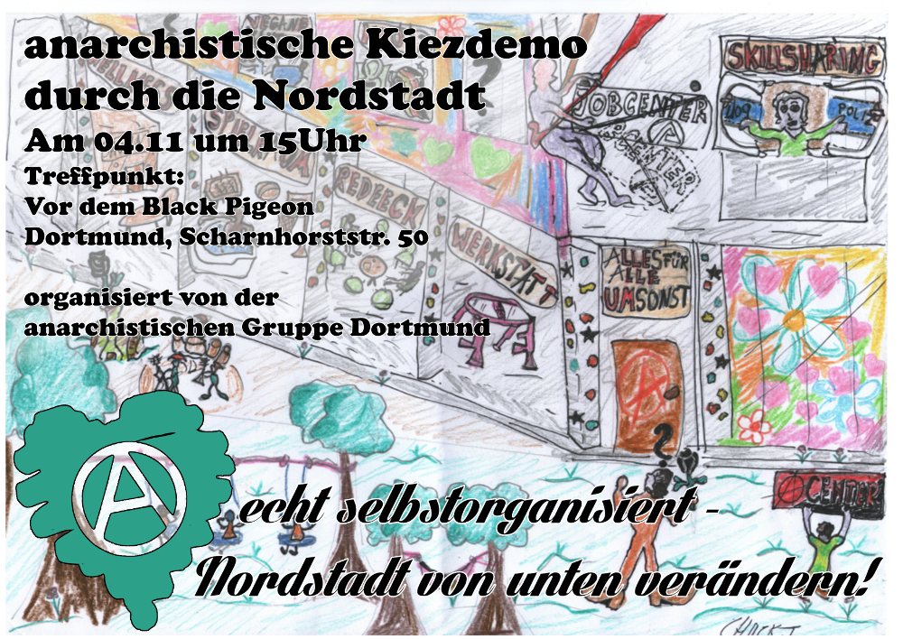 Am 04.11. wird es ab 15.00 Uhr eine anarchistische Kiezdemo durch die Nordstadt geben, Treffpunkt ist vor dem Anarchistischen Buch- und Kulturzentrum Black Pigeon. Mit der Demonstration wollen wir die vielschichtigen Probleme im Viertel aufzeigen, aber genauso die unterschiedlichen Perspektiven und Lösungsansätze von unten welche sich in den letzten Jahren entwickelt haben in die Öffentlichkeit tragen.