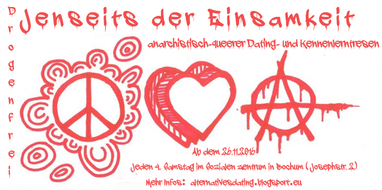 Es gibt viele Menschen in anarchistischen, linken, queeren oder feministischen Umfeldern, die Schwierigkeiten haben Menschen für (insbesondere körperliche/sexuelle) Beziehungen kennenzulernen. Das hat viele verschiedene Gründe. Vor einem Jahr organisierten wir daher im Sozialen Zentrum in Bochum ein alternatives Dating. Bei diesem Datingkonzept gab es aber einige Schwierigkeiten, weshalb wir uns gegen eine Wiederholung entschieden haben.