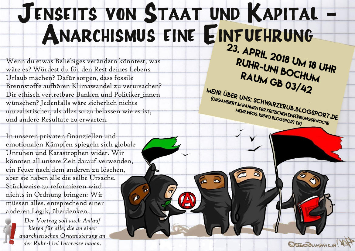 Der Vortrag soll auch Anlauf bieten für alle, die an einer anarchistischen Organisierung an der Ruhr-Uni Interesse haben.