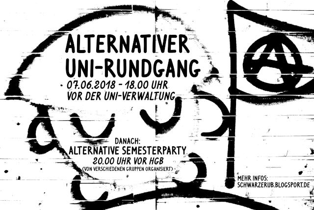 Beim alternativen Uni-Rundgang zeigen wir euch spannende Ecken des Campus und erzählen ältere und neuere Anekdoten aus der Geschichte antiautoritärer Bewegungen an der Uni. Außerdem verbinden wir die Geschichte der Uni mit der Geschichte der restlichen Welt, denn die Uni befindet sich nicht in einem Vakuum und auch dort spiegeln sich globale Unruhen und Katastrophen wider. Stationen sind coole Orte wie das politische Archiv oder der Frauen*raum, aber auch Einrichtungen, die viele Menschen eher unterdrücken als ihren Bedürfnissen zu dienen. Schlussendlich wird die Frage beantwortet: Kommt mensch nach 21.00 Uhr eigentlich irgendwie in die Unigebäude rein? Los geht’s am 07.06.2018 um 18.00 Uhr vor der Uni-Verwaltung.