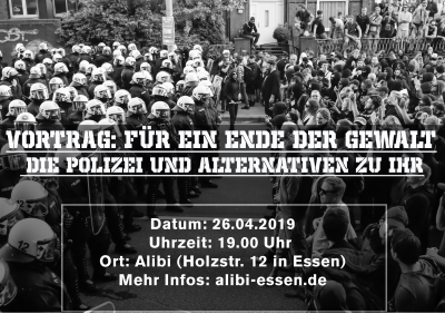 Eine anarchistische Gesellschaft – schön und gut, sagen einige. Aber wie will mensch die Polizei ersetzen? Wie sollen wir uns selbst schützen, ohne auf eine Instanz zurückzugreifen, die Gewalt ausübt und wie unterstützen wir sie sogar noch durch Kritik an ihrer Gewalt? Wie gehen wir so mit Konflikten um, dass sich unser Leben verbessert und wir dem Staat etwas Kontrolle entziehen? Diese und weitere Fragen sollen beim Vortrag der Schwarzen Ruhr-Uni in Kooperation mit der anarchistischen Gruppe Essen geklärt werden. Der Vortrag findet am 26.04.2019 um 19.00 Uhr im Alibi (Holzstraße 12) in Essen statt
