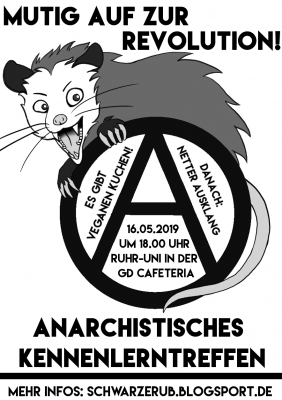 Das wirkt wie vereinzeltes Handeln, aber wir sind Teil einer globalen Bewegung, die sich Anarchismus nennt. Anarchist*innen glauben, dass Macht über Andere immer korrumpiert und jede*r, die*der herrscht, gezwungen ist vor allem ihre*seine Macht zu erhalten, daher organisieren wir uns ohne Anführer*innen. Außerdem lehnen wir Parteien und uns wählen zu lassen ab, denn auch die Hierarchien und Zwänge in Parlamenten und Parteien korrumpieren und verhindern freiheitliche Veränderungen. Wir wollen uns auch den Staat und seinen Zwangsapparat nicht zu eigen machen, denn zu Selbstbestimmung können Menschen nicht gezwungen werden. Falls du mit uns an einer revolutionären Änderung der Welt arbeiten willst, komme zum anarchistischen Kennlerntreffen an der Ruhr-Uni am 16.05.2019 um 18.00 Uhr in der zukünftigen Cafeteria von GD (Ebene 03).