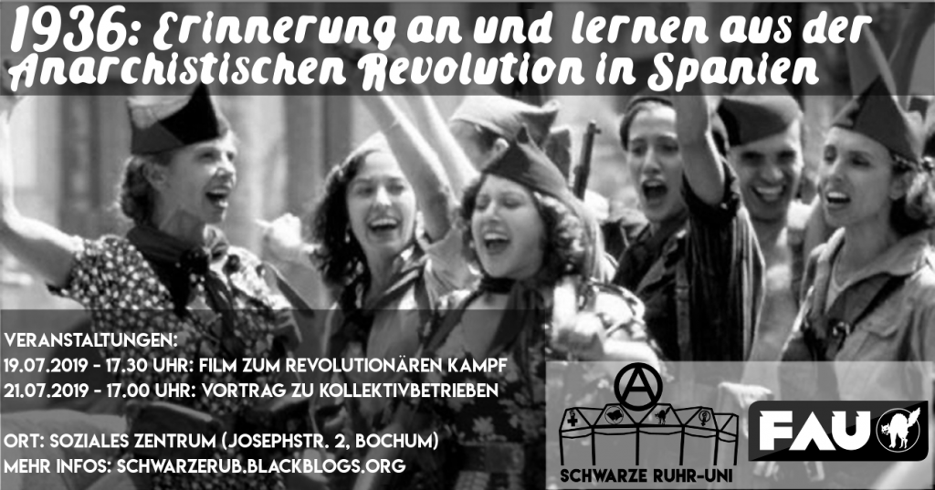 Vom 19.-21. Juli jährt sich die Soziale Revolution 1936 in Spanien. Eines der wohl bedeutsamsten Ereignisse in der anarchistischen Geschichte. Tausende von selbstverwalteten Betrieben und Landkommumen entstanden – teilweise wurden Geld und Eigentum abgeschafft. Gleichzeitig fand der geschichtlich größte Kampf der Arbeiter*innenbewegung gegen den Faschismus statt.