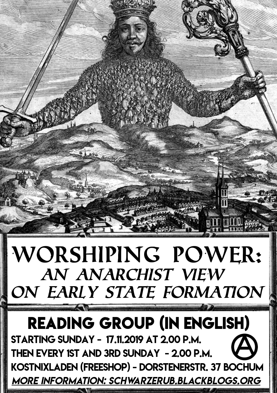 The State is the least questioned institution of our society. School and university teach us of its necessity for keeping the social peace, while millions were and are slaughtered by states. Worshiping Power – An Anarchist View of Early State Formation by Peter Gelderloos is a brilliant anthropological study of the states formation and the resistance against it. Based on newest research the book tries to debunk the myths about states and give an comprehensive analysis on how they developed. In the reading group, our attempt is to explore why the state never was a tool for emancipation, its formations throughout history, and the ways states might have been fought off or destroyed.