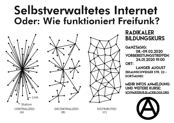 Bis zum Mittwoch, den 05.02.2020 um 23.59 Uhr könnt ihr Euch noch für den Radikalen Bildungskurs Freifunk&Meshnets: Dezentrale Informationsnetzwerke anmelden. Der Kurs findet abweichend nur am Samstag, den 08.02.2020 statt. Hier nochmal der Ankündigungstext des Kurses: