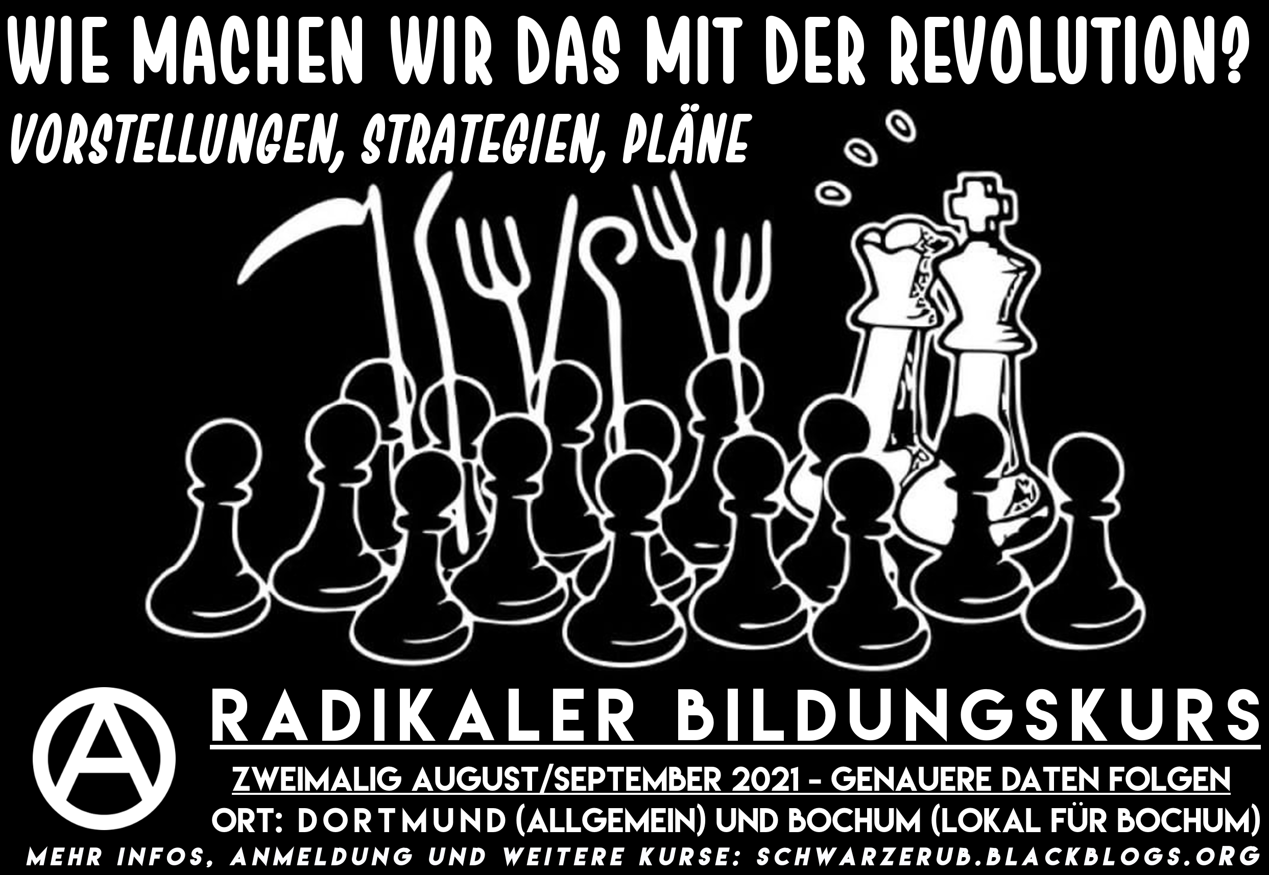 Daher wollen wir erarbeiten, wie heute eine revolutionäre Selbstorganisation aussehen kann. Was für neue Projekte brauchen wir? Wie kommen wir dann über die Vereinzelung kleiner Projekte hinaus, hin zum Aufbau von Parallelgesellschaften¹ im größeren Maßstab? Wie können wir im Angesicht der sich verschärfenden Lage handlungsfähig werden, statt ohnmächtig zu bleiben und stets höchstens reagieren zu können? Natürlich haben wir keine fertigen Antworten, sondern wollen gemeinsam mit euch nach revolutionären Wegen suchen. Der Bildungskurs wird mindestens zwei Mal stattfinden: Einmal spezifisch für Menschen aus Bochum und Umgebung, und einmal allgemein für alle Interessierten. Eventuell bieten wir ihn dann auch nochmal für Dortmund und Umgebung an.
