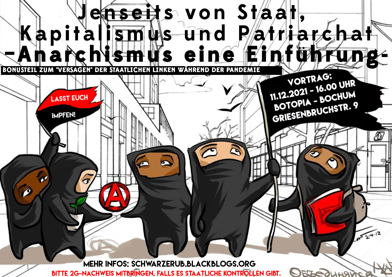 Bei der Pandemie, Klimawandel oder auch der Pflegekrise zeigt sich, dass staatslinke Ansätze gescheitert sind. Anarchist*innen haben die Unmöglichkeit grundsätzliche Probleme über den Staat zu lösen schon lange vorhergesagt. Für alle, die Jetzt und für die Zukunft nach Alternativen suchen, möchten wir mit unserem Vortrag einen Ausgangspunkt bieten: