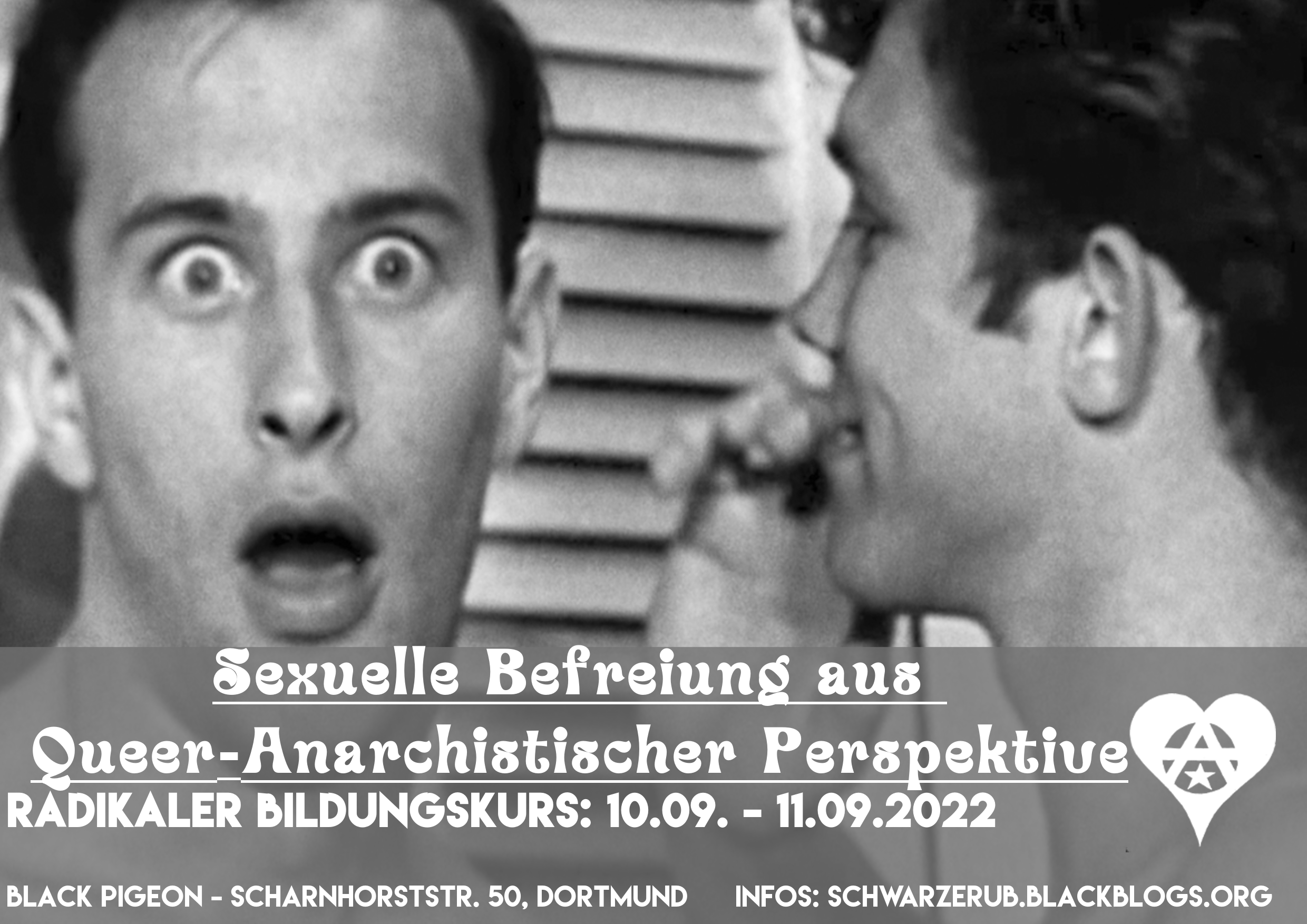 Bis zum Donnerstag, den 08.09.2022 um 23.00 Uhr können sich noch Menschen für unseren Bildungskurs Sexuelle Befreiung aus Quere-Anarchistischer Perspektive anmelden. Der Kurs findet vom 10.09-11.09.2022 im Black Pigeon (Dortmund – Scharnhorststrasse 50) statt. Schreibt dafür bitte eine E-Mail an: [email protected]. Nachfolgend noch einmal der Ankündigungstext: