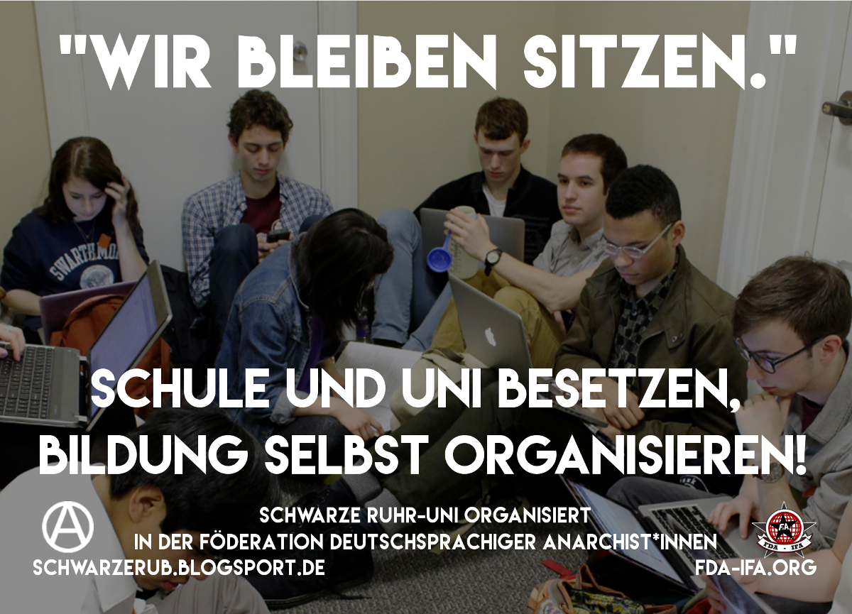 Lassen wir unsere Bildung nicht länger kontrollieren! Nehmen wir uns die Räume, die wir brauchen, zurück: Wir bleiben sitzen und bilden uns selber!