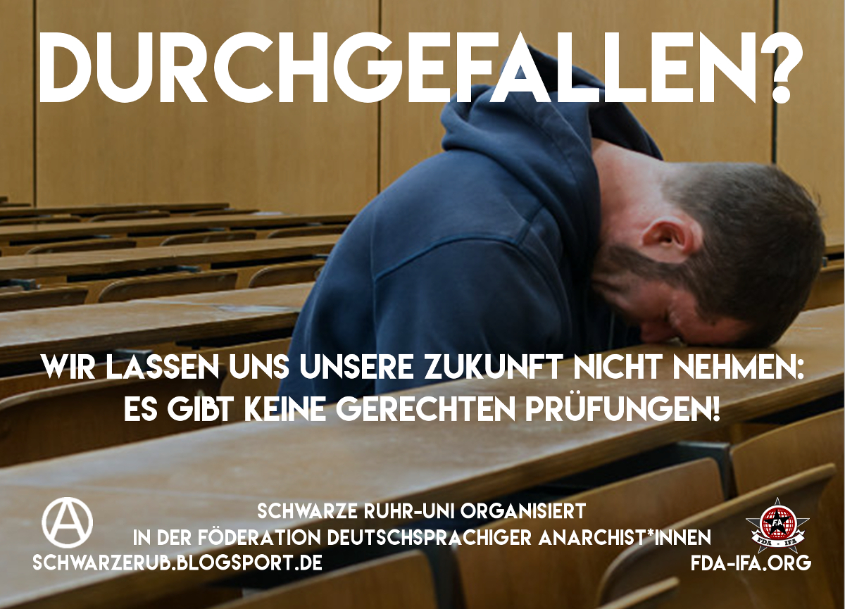 Anarchistische Kritik an Schule und Uni ist im deutschsprachigen Raum kaum präsent. Es gibt nur wenige anarchistische Gruppen an Unis und Schulen. Wir haben daher eine eigene Reihe von Aufklebern entworfen, um dies zu ändern und Anarchismus vermehrt an Schulen und Unis zu tragen. Außerdem wollen wir den Widerstand gegen die Unterdrückung und Kontrolle des Wissens durch diese Institutionen und ihre Noten und Prüfungen vorantreiben. Wir haben in diesem Bereich bisher leider zu wenig getan und suchen daher gerade nach erfolgreichen Strategien. Über einen Austausch mit anderen Menschen würden wir uns daher sehr freuen. Die Aufkleber wurden mit Unterstützung der Föderation deutschsprachiger Anarchist*innen hergestellt, in der wir organisiert sind. Sie sind jetzt über den anarchistischen Mailorder “Black Mosquito” bestellbar. Zu jedem Aufkleber und dessen Inhalt haben wir einen kurzen Text geschrieben. Da die Ablehnung von Prüfungen ein sehr umstrittenes Thema ist, werden wir dazu später noch einen längeren Text veröffentlichen.