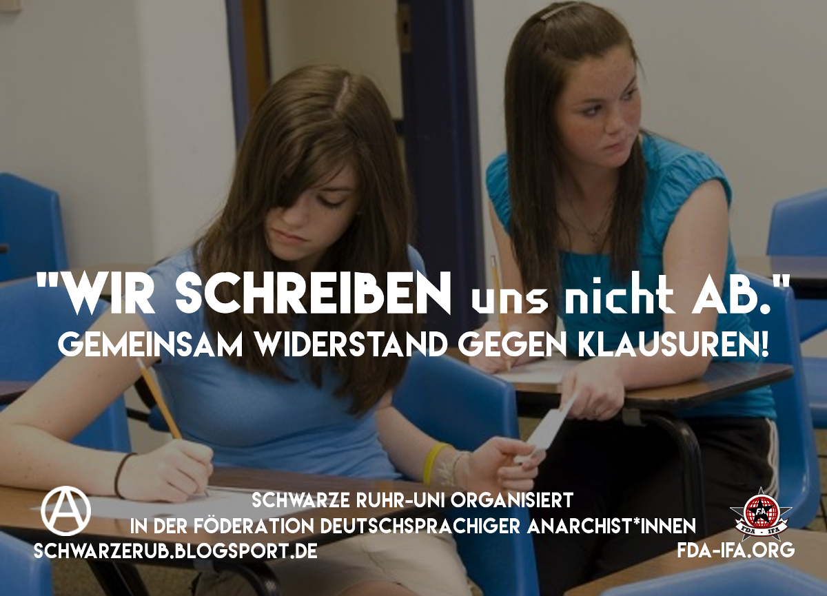 Klausuren sollen uns zur Anpassung und Verinnerlichung eines ganz bestimmten Wissens zwingen. Dieses Wissen dient unter anderem dem Erhalt von Herrschaft und damit unserer Unfreiheit, seine Anwendung und Inhalte bringen Klimawandel, Kapitalismus, Staat, Patriarchat, Rassismus und tausend andere Probleme/Unterdrückungsformen hervor. In der Zeit, in der wir für Klausuren „lernen“ müssen, können wir uns kein anderes Wissen aneignen. Indem wir gemeinsam bei Klausuren abschreiben, minimieren² wir den Aufwand und die Zeit, die uns Klausuren nehmen. So gewinnen wir einen Teil unserer Selbstbestimmung über das, was wir lernen, wieder und können beginnen uns Wissen anzueignen, das uns bei der Lösung unserer Probleme hilft anstatt diese hervorzubringen.
