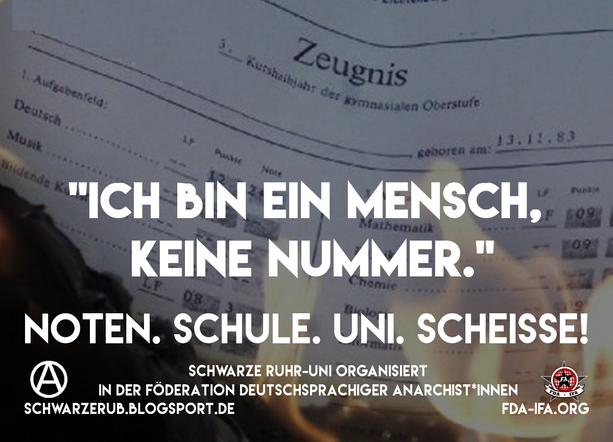 Noten sind ein Mittel um uns unsere Selbstbestimmung zu nehmen. Sie machen uns zu Zahlen, ordnen uns in eine Rangfolge ein. Wer in dieser Rangfolge unten steht, wer in der Schule, Universität oder während einer anderen Ausbildung „zu schlecht“ ist, dem wird der Zugang zu bestimmten gesellschaftlichen Ressourcen verweigert. Die Betroffenen können nicht studieren, eine bestimmte Ausbildung machen oder haben schlechtere Möglichkeiten, einen „Arbeitsplatz“ zu finden.