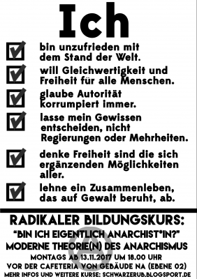 Dieses Semester wollen wir daher unseren Schwerpunkt darauf setzen Bildungsarbeit zu machen und unsere radikalen Bildungskurse fortzuführen. Weil wir die Erfahrung gemacht haben, dass auch viele Menschen zu ins in die Gruppe kommen, die nicht wissen ob sie sich mit anarchistischen Handeln und Theorien wirklich identifizieren, bieten wir dieses Semester einen Kurs zu moderner anarchistischer Theorie an. Gerade Menschen, die überlegen in unserer Gruppe aktiv zu werden, legen wir an Herz diesen zu besuchen. Am Ende des Semesters wird es auch wieder ein anarchistisches Kennenlerntreffen an der Ruhr-Uni geben. Falls ihr vorher schon aktiv werden wollt schreibt uns eine E-Mail an: schwarze-ruhr-uni(at)riseup.net