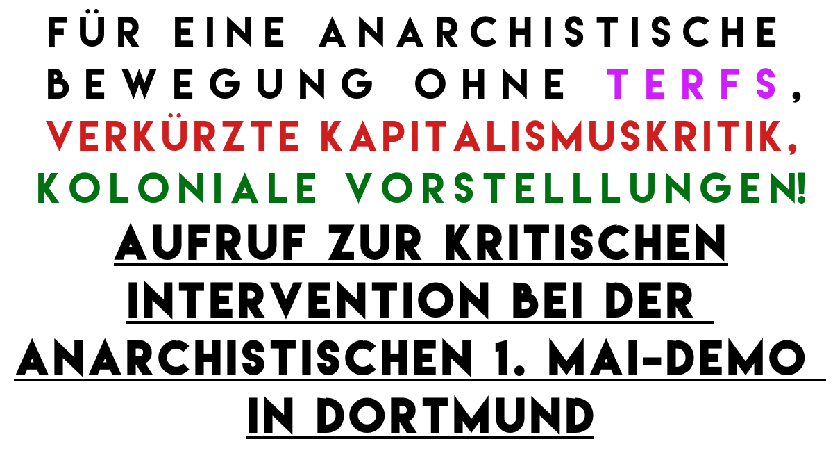 Eigentlich wollten wir nie direkt öffentlich Kritik üben, sondern hatten gehofft, jene Punkte (wie Sichtbarkeit von Trans, Inter, Nichtbinären und Agendern, gute Kapitalismus- und Staatskritik, einer aktuelles, nicht-identitäres Klassenverständnis und Bewusstsein über die eigene koloniale Rolle), die uns bezüglich des Aufrufs zum anarchistischen ersten Mai in Dortmund wichtig sind, bzw. die fehlen, in Form einer Rede auf der Demonstration anbringen zu können. Wir wollten positiv darauf hinweisen, worauf Anarchist*innen bei ihren Analysen achten sollten und in welche gefährlichen Richtungen sich der Anarchismus sonst bewegen kann. Dabei wollten wir weder die Orga des 1ten Mai, noch den Aufruf direkt benennen, weil es uns vor allem um Kritik an den Inhalten geht, nicht wer sie äußert. Die Organisator*innen des anarchistischen 1. Mai möchten dies aber nicht und zwingen uns damit öffentlich Stellung zu ihrem Aufruf und den teils sehr problematischen Vorstellungen in ihm zu nehmen. Wir finden dies traurig, unsolidarisch, ausschließend und unnötig eskalativ.